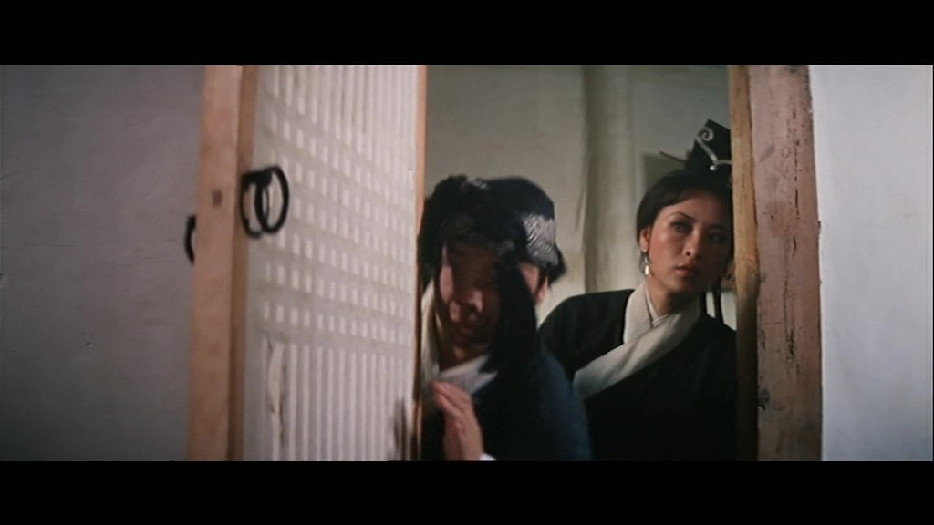 Ce sont des voleurs dont l’agilité est démontrée dans une longue séquence où Renarde Blanche et Serrure d’or traversent tout le monastère pour arriver dans la chambre qui contient tous les parchemins. Il leur faut éviter d’être vus par les moines, se dissimuler dans les cachettes des bâtiments et avancer à toute vitesse. Pour cela, King Hu monte son film à un rythme alerte. Les déplacements sont suivis en travelling, les regards sont l’objet de gros plans sur les deux voleurs montés en contrechamp des plans larges où l’on découvre les moines qui ne se doutent de rien. Le monastère est filmé comme un labyrinthe composé de nombreux couloirs. Il est absolument impossible de se rendre compte de l’architecture du bâtiment, tout cela reste mystérieux afin de perdre le spectateur dans les méandres des déplacements. Mais Renarde Blanche ne parvient pas à ouvrier le loquet de la bibliothèque. Un moine, Hui Wen (Lu Chan), va l’aider sans qu’on ne lui demande rien.
