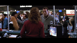 Il est cool John McLane, trop cool pour le flic Vito (Robert Constenzo) devant l'aéroport qui a appelé la fourrière pour évacuer la voiture de la belle-mère de John McLane. Encore un jour de Noël qui commence sous de mauvais hospices. Il aurait du s'en douter dès le début que ça tournerait mal. La bagnole enlevée, il retourne à l'intérieur de l'aéroport. Il enlève son manteau, il porte un pull beige et une chemise et une petite chemise sombre à petits carreaux.