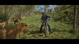 Après plus d'une heure de confrontation avec les fauves, Hank retrouve enfin Madelaine. Je n'ai pas vraiment eu peur pour elle et ses enfants, mais je suis resté estomaqué par cette idée de faire jouer tout ce beau monde avec des lions sans aucun trucage, c'est ça le truc de Roar, ce malaise de plus en plus prégnant qui me fait rire jaune, d'autant que je ne peux pas m'empêcher de penser qu'ils sont quand même très couillons de se cacher si maladroitement, de tenter de se séparer pour se cacher avant de tous se chercher alors qu'ils sont à côté les uns des autres.