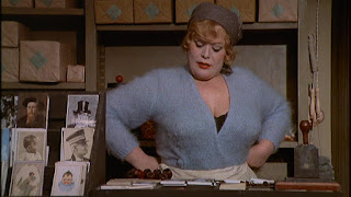gros plan, la buraliste (Maria Antonietta Beluzzi) au corsage